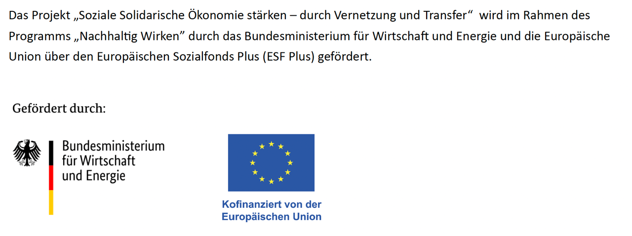 Gefördert wird das Projekt durch das Bundesministerium für Wirtschaft und Energie (BMWE) im Rahmen des Programms „Nachhaltig wirken“. Es ist Teil der „Nationalen Strategie für Soziale Innovationen und gemeinwohlorientierte Unternehmen“ (SIGU) und durch den Europäischen Sozialfonds Plus (ESF+) sowie die Projektpartner kofinanziert.