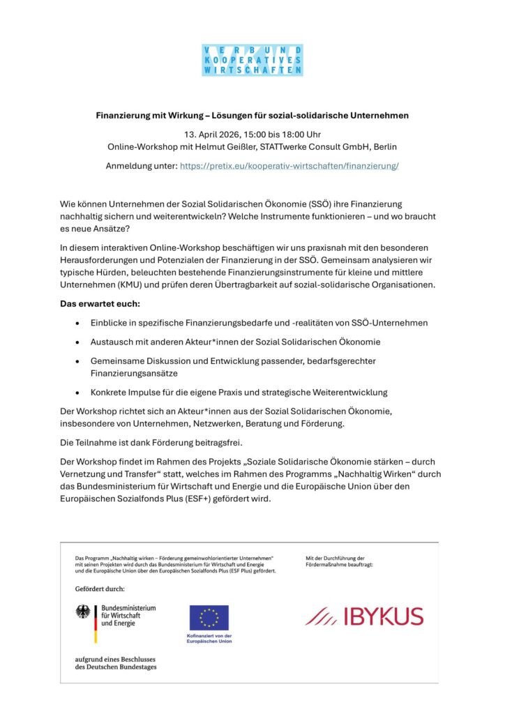 - Wie nutze ich das Netzwerk meines SSÖ-Unternehmens für auf mein Unternehmen abgestimmte Instrumente der Eigenfinanzierung, der Beteiligungsfinanzierung, der Finanzierung durch Investoren (Beispiel: Instrument des / der Investierenden Genossen/in)